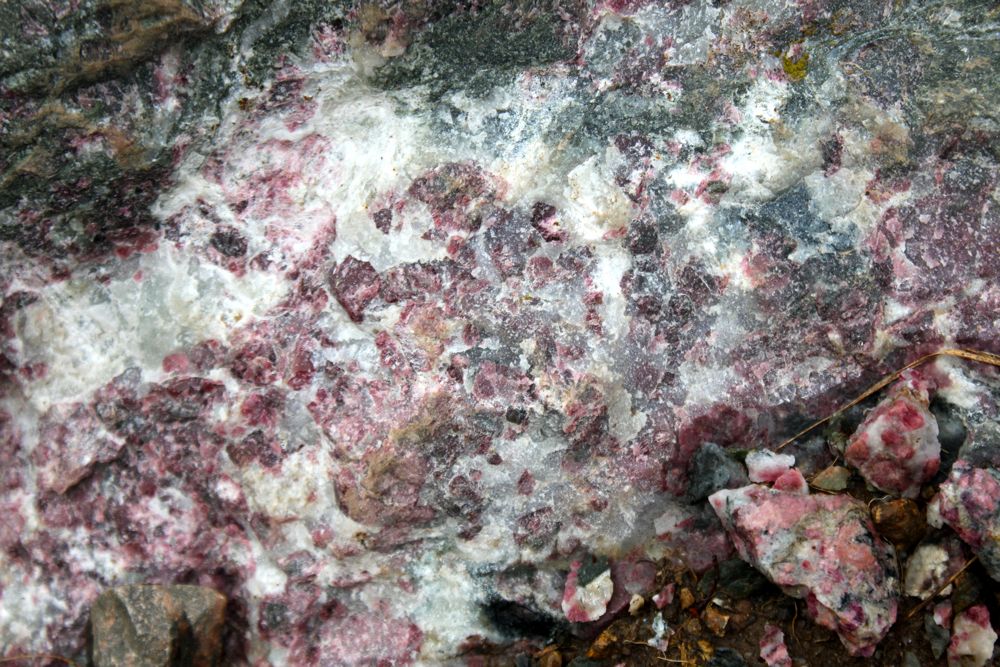 Close up of part of the “discovery outcrop” of the Norra Kärr intrusion, with abundant coarse-grained pink eudialyte.