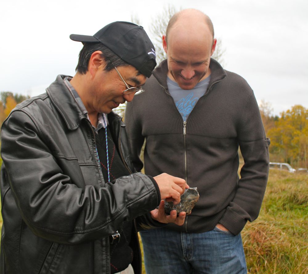 Home » » Yasushi Watanabe (l), Senior Geologist with the Geological Survey of Japan, and Mark Saxon (r), President & CEO of Tasman Metals, discuss a rock sample at the Norra Kärr deposit.