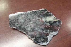 Sample of coarse grained eudialyte-rich larkapite (amphibole rich nepheline syenite) from the Norra Kärr deposit.